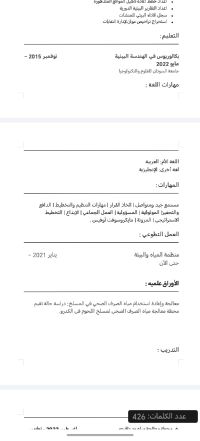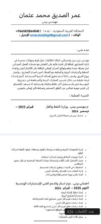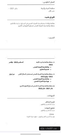 مهندس بيئي (أخصائي بيئي) مقيم في جدة ولدي اقامة سارية وجاهز للعمل فورا وأيضا لدي خبرة في التعامل مع منصة المركز الوطني للرقابة على الالتزام واعداد خطط الإدارة البيئية استخراج التصاريح البيئية اعداد دراسات تقييم الاثر البيئي لمشاريع الفئة الثانية والثالثه اعداد دراسات تدقيق الاثر البيئي اعداد دراسات نطاق تقييم الاثر البيئي لمشاريع الفئة الثالثه اعداد خطط اعادة تأهيل المواقع المتدهورة