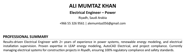 Electrical Engineer - Power & Construction Projects Results - driven Electrical Engineer with hands - on experience in power systems, electrical installation supervision, and renewable energy modeling. Skilled in site inspections, testing & commissioning, load analysis, and ensuring compliance with international electrical standards. Proficient in AutoCAD Electrical, LEAP energy modeling, MATLAB, and