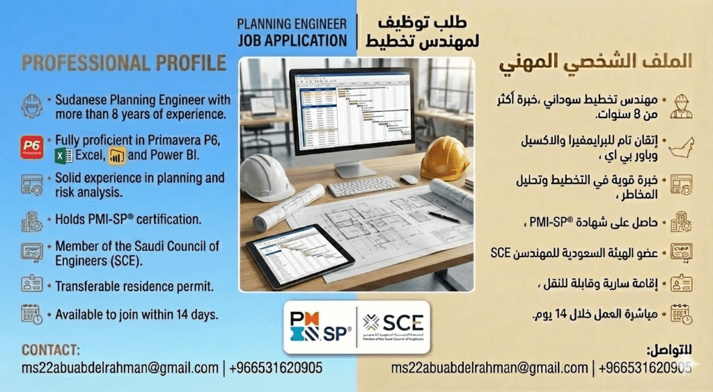محمد سعيد مهندس تخطيط سوداني حاصل على شهادة PMI - SP واحضر حاليا لل PMP خبرة 8 + سنوات (2017) مسجل في الهيئة السعودية للمهندسي اتقان تام للبرامج الهندسية p6, Excel إقامة قابلة للنقل، المام بمتطلبات مشاريع المياه الوطنية، جاهز للانضمام مباشرة