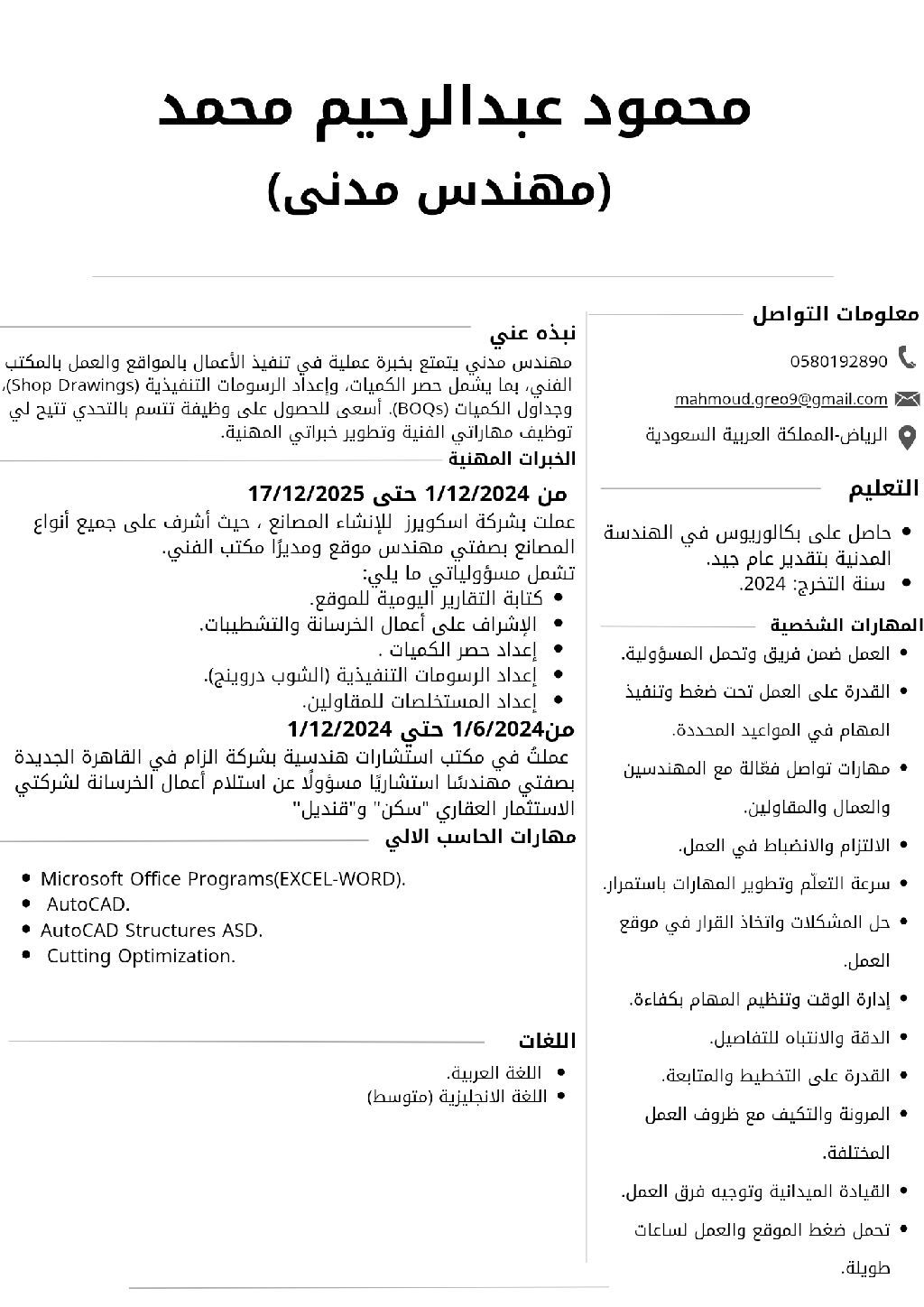 A civil engineer with two years of experience, currently located in Riyadh, is seeking a job opportunity as a site engineer or assistant engineer. I have experience in concrete work, finishing, quantity surveying, shop drawings, and progress payment certificates, and I am able to work effectively as part of a team and handle pressure