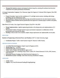 Accredited Electrical Engineer by the Saudi Council of Engineers (SCE) with over 7 Years Exp. Expert in LV systems, Infrastructure & Technical Office. Key projects New Al Mansoura City. Skills AutoCAD, Revit, Dialux EVO, BOQ. Currently in Al Khobar, KSA Transferable Iqama Available immediately. This CV details my professional journey in supervision and design compliance