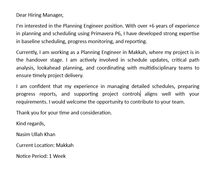 Dear Hiring Manager, I am interested in the Planning Engineer position. With over + 6 years of experience in planning and scheduling using Primavera P6, I have developed strong expertise in baseline scheduling, progress monitoring, and reporting. Currently, I am working as a Planning Engineer in Mecca, where my project is in the handover stage