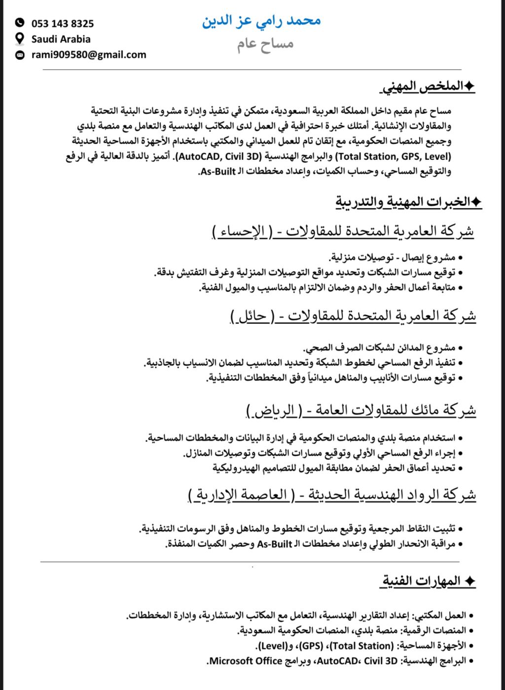 مساح عام، أجيد العمل بالمكاتب الهندسية ومواقع الإنشاءات. خبرة في تنفيذ مشروعات البنية التحتية والمقاولات. أبرز المهارات اتقان تام لمنصة بلدي) والمنصات الحكومية. العمل على اجهزة (Total Station, GPS, Level) اجادة (AutoCAD, Civil 3D) وحساب الكميات. الخبرة مشاريع كبرى في الرياض، الاحساء، حائل، والعاصمة الادارية