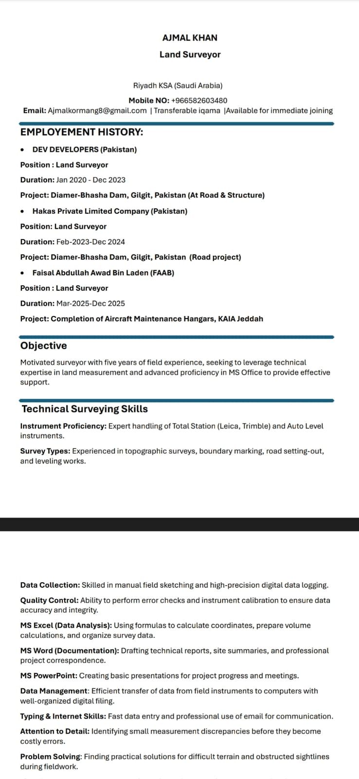 Application For Land Surveyor Available for Immediate Joining) Professional Land Surveyor 5 Years of Experience Riyadh, KSA Results - driven Land Surveyor with 5 years of comprehensive experience in Riyadh, Saudi Arabia. I specialize in high - accuracy data collection and site layout using advanced instruments, including Leica TS10 and TS11 total stations, as well as E800 GPS/ GNSS systems. I am proficient