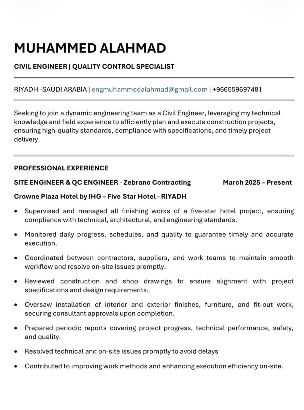 أنا مهندس مدني من سوريا ولدي الجنسية التركية، 0559697481 عندي خبرة في أعمال الخرسانة وأعمال التشطيب، حصر الكميات وضبط الجودة، تسليم جميع الأعمال للاستشاري، تجهيز المستخلصات والتقارير نفذت 4 فلل سكنية فاخرة من أعمال الحفر الى تسليم المفتاح، وحاليا أشرف على أعمال تشطيب فندق فاخر من 18 طابق في التخصصي تابع لعلامة كراون بلازا ونحنا حاليا بمرحلة التسليم وابحث عن فرصة عمل جديدة