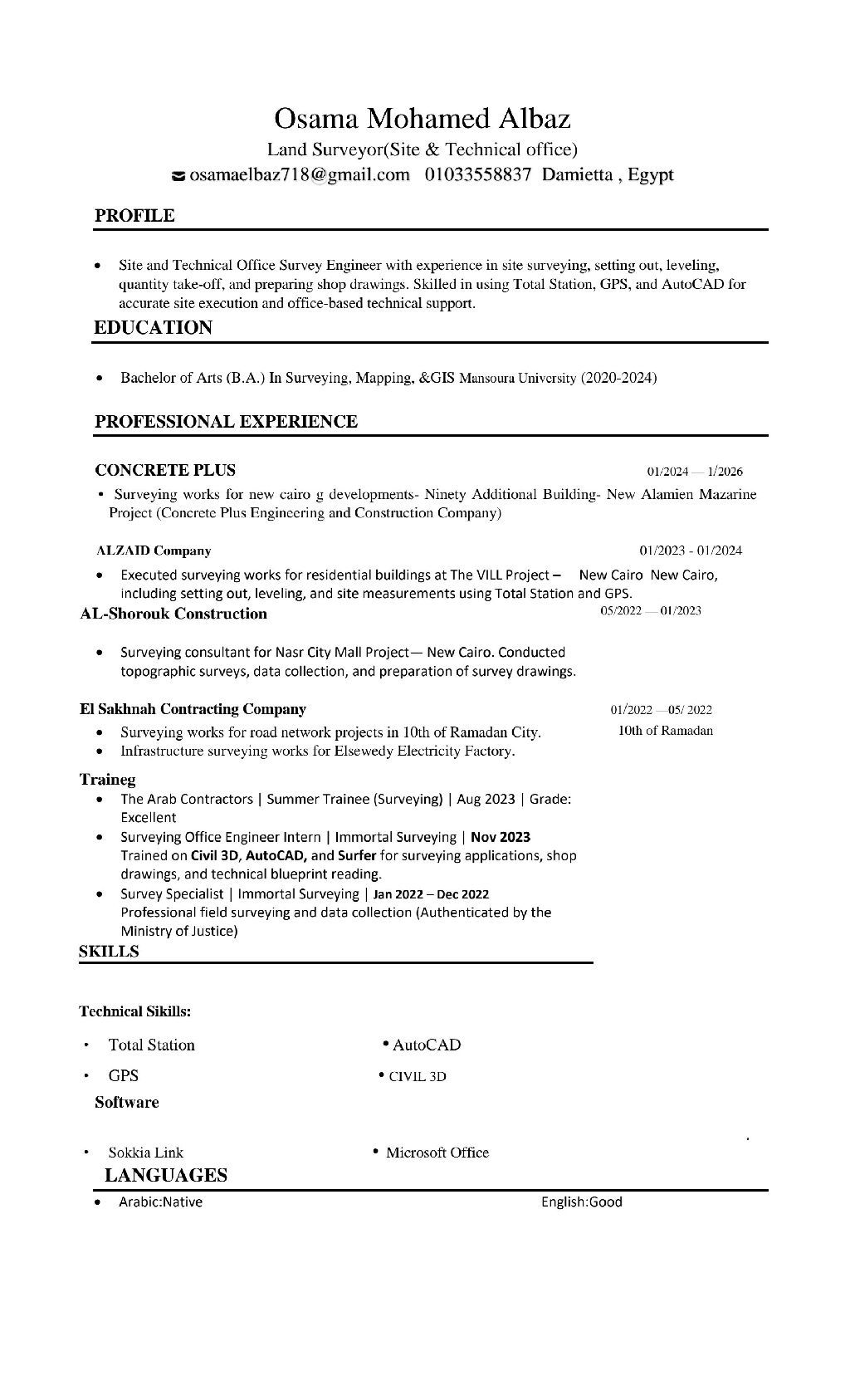 بكالوريوس في المساحة جامعة المنصوره خريج 2024 متواجد في الرياض إقامة سارية 9 شهور علي دراية بجميع الاجهزة المساحية والتوقيع والرفع المساحي