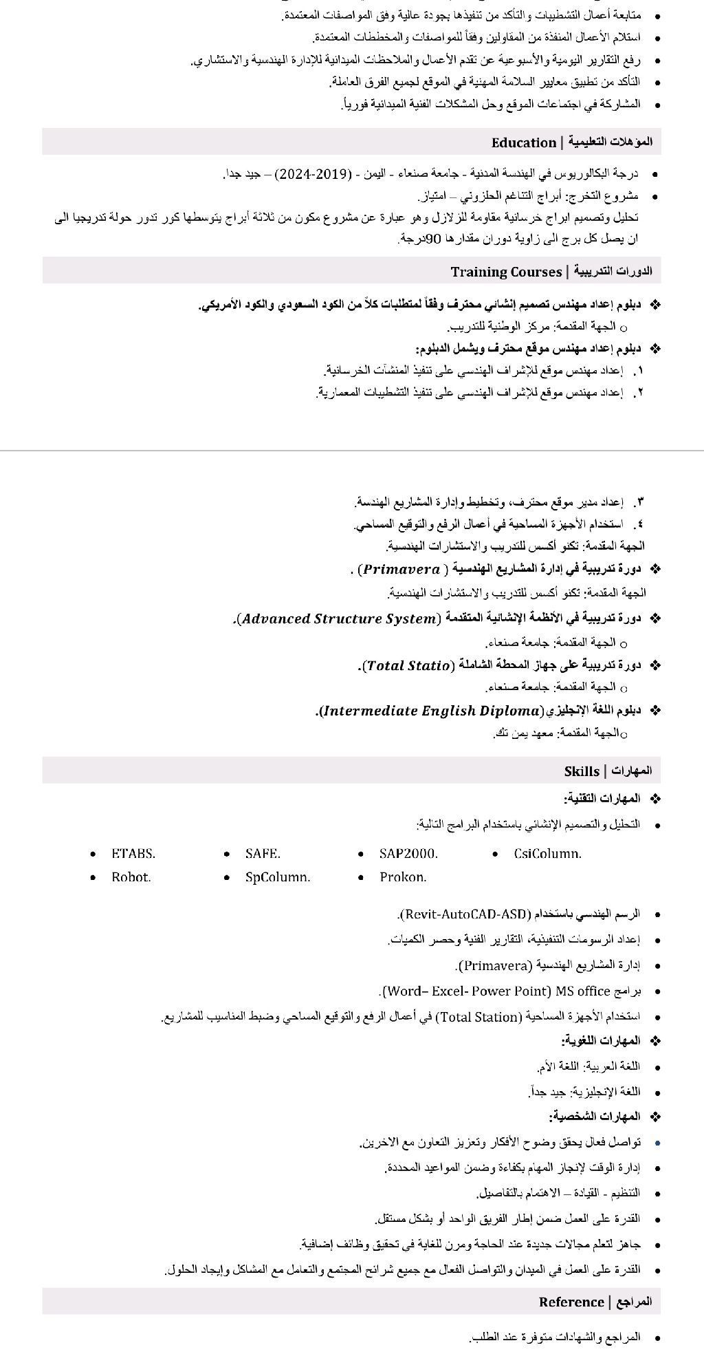مهندس مدني بخبرة 3 سنوات في مجالات التصميم الانشائي، التنفيذ، والاشراف على المشاريع السكنية ومشاريع الطرق. اعمل وفق المخططات والمواصفات العالمية، وامتلك خبرة متقدمة في الإدارة الموقعية للعمل، ضبط الجودة، واعداد الجداول الزمنية. متمكن باحترافية من استخدام أحدث البرامج الهندسية والادارية (AutoCAD, Revit, ETABS, Robot, SAFE, Primavera P6)