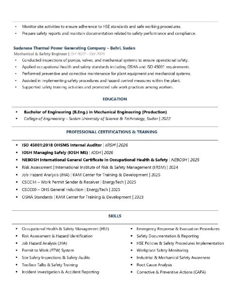Certified Occupational Health & Safety Specialist (NEBOSH) seeking a new opportunity as a professional HSE Supervisor. I hold prestigious international certifications including NEBOSH, Risk Assessment from IIRSM, and ISO 45001 Internal Auditor. I have practical and administrative experience, familiarity with unified contracts, and possess a valid transferable residency. I am eager to contribute to