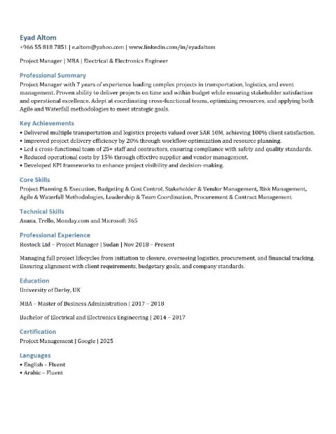 I am a Mechanical Engineer (UET Lahore) with growing experience at UNIFAB KSA in tendering, project documentation, and cost estimation, now seeking a visa - sponsored opportunity in Riyadh to build my career in engineering and project management. I hold multiple professional certifications including Google Project Management Professional Certificate (Agile, Planning, Execution) Oracle Primavera P6