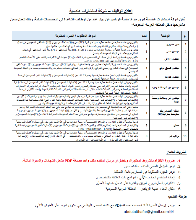 نحن شركة استشارات هندسية كبرى بمدينة الرياض نبحث عن كادر فني متواجد في أي مكان داخل المملكة يتمتع بالخبرة المذكورة بالصورة المرفقة، مكان العمل سكاكا