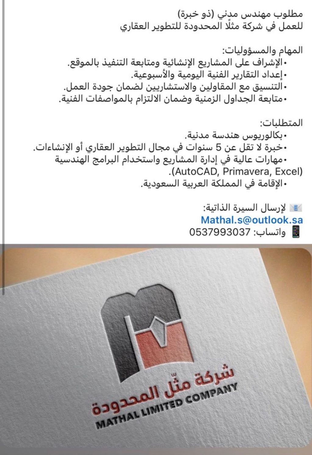 انضم الى فريقنا - مطلوب مهندس مدني ذو خبرة في شركة مثل المحدودة للتطوير العقاري، نحن شركة ناشئة في طموح كبير، نعمل على تنفيذ مشاريع نوعية ونبحث عن مهندس مدني قيادي يكون شريكا في النجاح وليس مجرد موظف. دورك معنا قيادة والاشراف على الأعمال الانشائية بالموقع من البداية وحتى التسليم. متابعة التنفيذ اليومي وضمان الجودة والالتزام بالمخططات. التنسيق المباشر مع المقاولين والاستشاريين واتخاذ القرارات الفنية