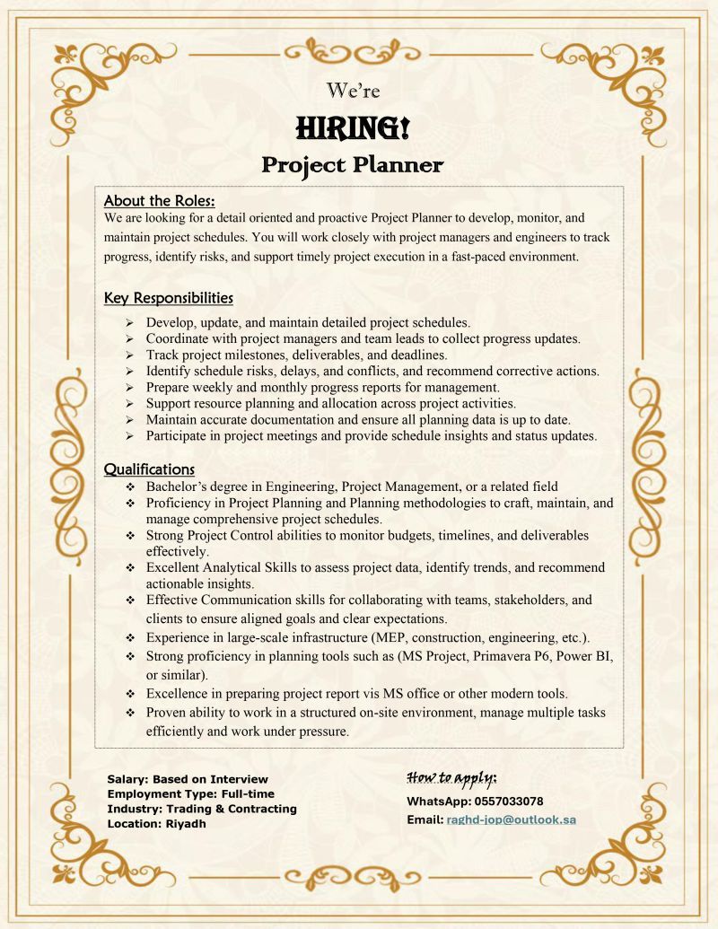 مخطط مشاريع نبذة عن الوظيفة نبحث عن مخطط مشاريع دقيق واستباقي لتطوير ومتابعة والمحافظة على جداول المشاريع. سيعمل المرشح بشكل وثيق مع مديري المشاريع والمهندسين لمتابعة التقدم، تحديد المخاطر، ودعم تنفيذ المشاريع في بيئة عمل سريعة. المهام والمسؤوليات اعداد وتحديث والمحافظة على جداول المشاريع التفصيلية. التنسيق مع مديري المشاريع وقادة الفرق لجمع تحديثات التقدم. متابعة مراحل المشروع العمل حي المروج