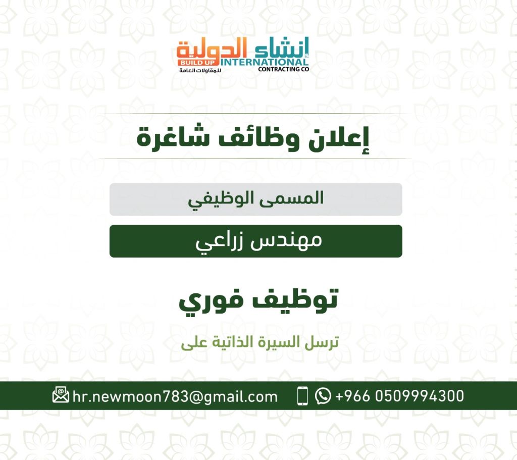 انشاء الدولية للمقاولات العامة بحاجة الى مهندس زراعي أرجو ارسال سيرة ذاتية الرياض حي الملز