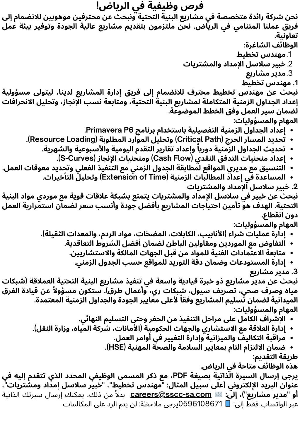 فرص وظيفية في الرياض نحن شركة رائدة متخصصة في مشاريع البنية التحتية ونبحث عن محترفين موهوبين للانضمام الى فريق عملنا المتنامي في الرياض. نحن ملتزمون بتقديم مشاريع عالية الجودة وتوفير بيئة عمل تعاونية. الوظائف الشاغرة 1. مهندس تخطيط 2. خبير سلاسل الإمداد والمشتريات 3. مدير مشاريع 1. مهندس تخطيط نبحث عن مهندس تخطيط محترف للانضمام الى فريق إدارة المشاريع لدينا، ليتولى مسؤولية اعداد الجداول الزمنية المتكاملة