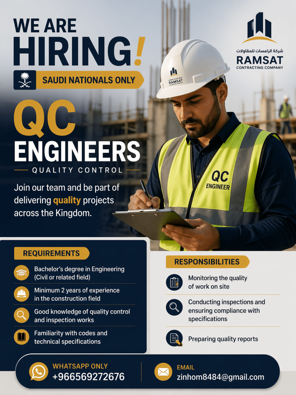 QC Engineers Required Ramsat Contracting Company announces its need to hire QC Engineers to work on its projects within the Kingdom. Requirements Bachelor’s degree in Engineering (Civil or related field) Minimum 2 years of experience in the construction field Good knowledge of quality control and inspection works Familiarity with codes and technical specifications Responsibilities Monitoring the