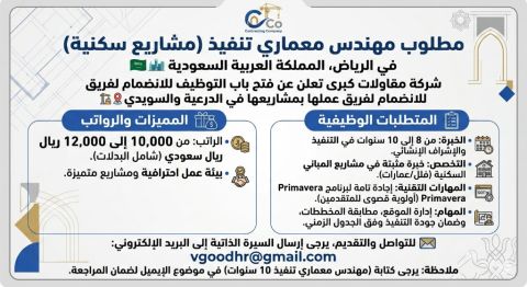 مطلوب مهندس معماري تنفيذ (مشاريع سكنية) لمقيمين الرياض - شركة مقاولات تطلب للعمل بم شارعها في حي الدرعية وحي السويدي مهندس معماري تنفيذ بخبرة عملية واسعة للانضمام الى فريقنا في مشاريع الإنشاءات السكنية. المتطلبات الوظيفية الخبرة من 8 الى 10 سنوات في التنفيذ والاشراف الانشائي. التخصص خبرة مثبتة في مشاريع المباني السكنية (فلل / عمارات) المهارات التقنية اجادة تامة لبرنامج Primavera اولوية قصوى للمتقدمين