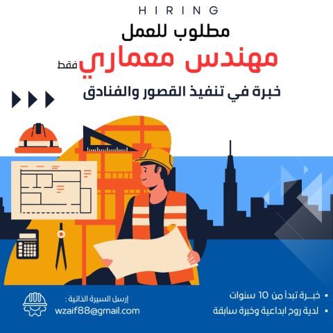 مطلوب للعمل لدي شركة مقاولات واستشارات هندسية في الرياض - حي إشبيلية مهندس معماري شرط أساسي خبرة في تنفيذ القصور والفنادق خبرة لا تقل عن 10 سنوات شرط التفرغ لبدء العمل فورا برجاء إرسال السيرة الذاتية علي الايميل