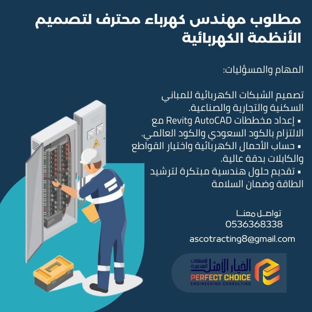 مطلوب مهندس كهرباء للعمل في الرياض حي الملز لتصميم الأنظمة الكهربائية تصميم الشبكات الكهربائية للمباني السكنية والتجارية والصناعية واعداد مخططات AutoCAD وRevit مع الالتزام الكود السعودي والكود العالمي وحساب الأحمال الكهربائية واختيار الكابلات بدقة أيضا تقديم حلول هندسية مبتكرة لترشيد الطاقة وضمان السلامة تصميم مخططات انارة وقوى وتصميم انضمة التأريض والحماية الصواعق عمل أنظمة التحكم والاتمتة BMS