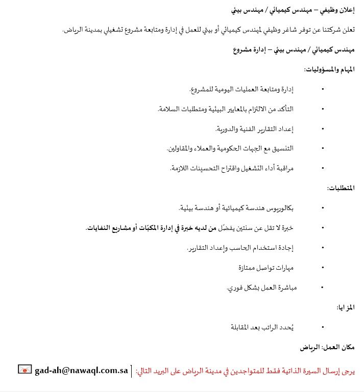 اعلان وظيفي - مهندس كيميائي / مهندس بيئي تعلن شركتنا عن توفر شاغر وظيفي لمهندس كيميائي أو بيئي للعمل في إدارة ومتابعة مشروع تشغيلي بمدينة الرياض. مهندس كيميائي / مهندس بيئي - إدارة مشروع المهام والمسؤوليات إدارة ومتابعة العمليات اليومية للمشروع. التأكد من الالتزام بالمعايير البيئية ومتطلبات السلامة. اعداد التقارير الفنية والدورية. التنسيق مع الجهات الحكومية والعملاء والمقاولين. حي الملقا