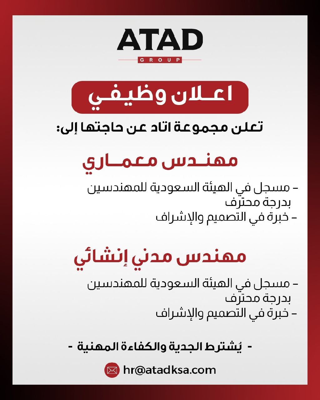 مطلوب مهندس معماري - مكتب استشارات هندسية في مدينة الرياض - بكالوريوس هندسة معمارية من جامعة معتمدة - خبرة لا تقل عن 8 سنوات في مجال التصميمات المعمارية والرسومات التنفيذية - شرط أساسي للقبول أن يكون حاصل على عضوية سارية في هيئة المهندسين بدرجة تصنيف محترف