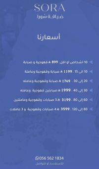 ضيافة سورا للمناسبات النسائية داخل الرياض نقدم مشروبات مختارة وتقديم أنيق يليق بالمناسبات قهوة وشاي مشروبات ساخنة وباردة حسب الباقة أسعارنا تبدأ من 899 ريال وتختلف حسب عدد الضيفات للحجز والاستفسار ارسلي واتساب الآن واذكري تاريخ المناسبة وعدد الضيفات ونرسل لك الباقات المتاحة
