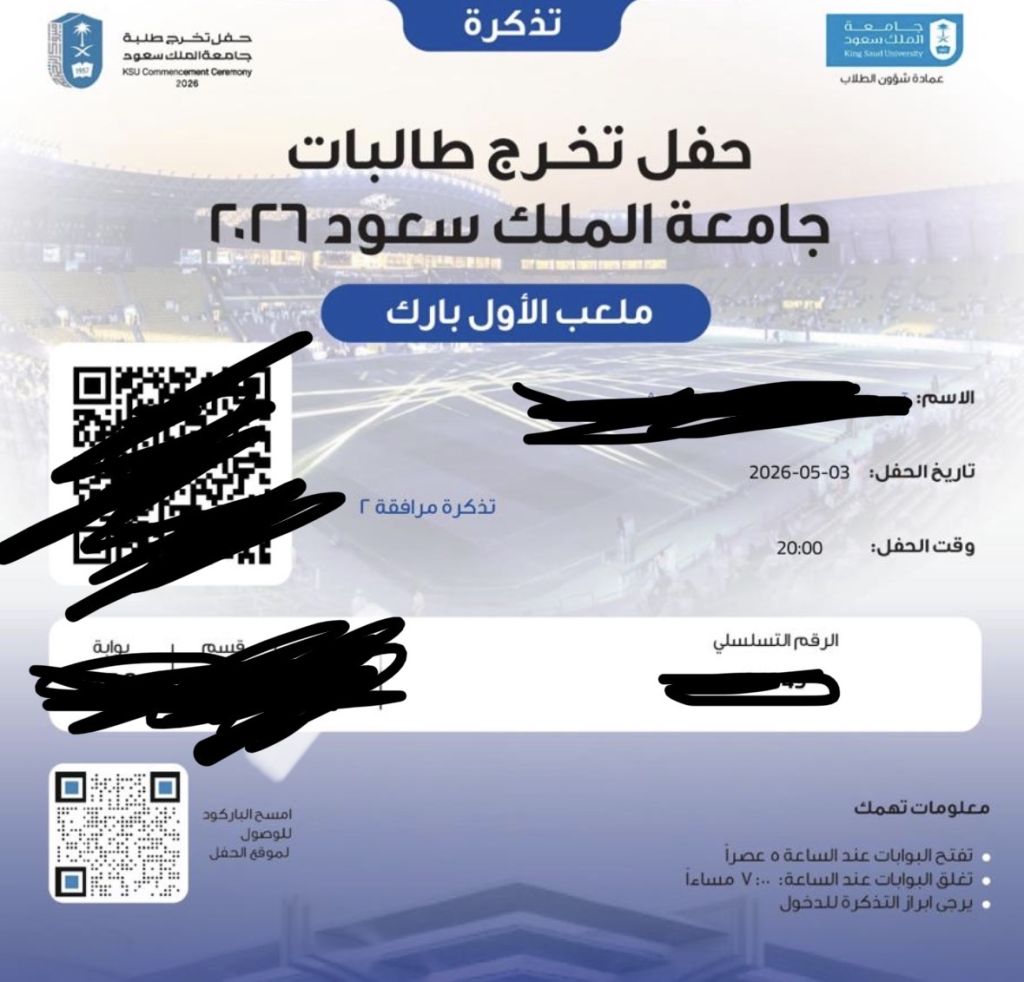 تذكرة حفل تخرج جامعة الملك سعود طالبات ب 250 وسعر قابل للتفاوض