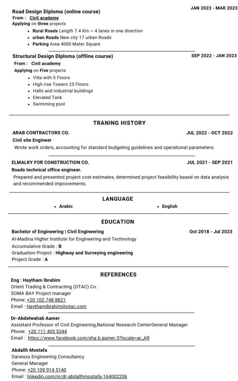 جاهز للعمل فورا - مهندس مدني طرق وبنية تحتية خبرة 3 سنوات في المكتب الفني وتنفيذ وصيانة مشاريع الطرق والبنية التحتية، متمكن من تطبيق المواصفات والكواد الهندسية والعقود المبنية على الأداء. أتقن Microsoft Officeg Civil 3Dg AutoCAD والبرامج ذات الصلة بالمجال، متواجد داخل السعودية