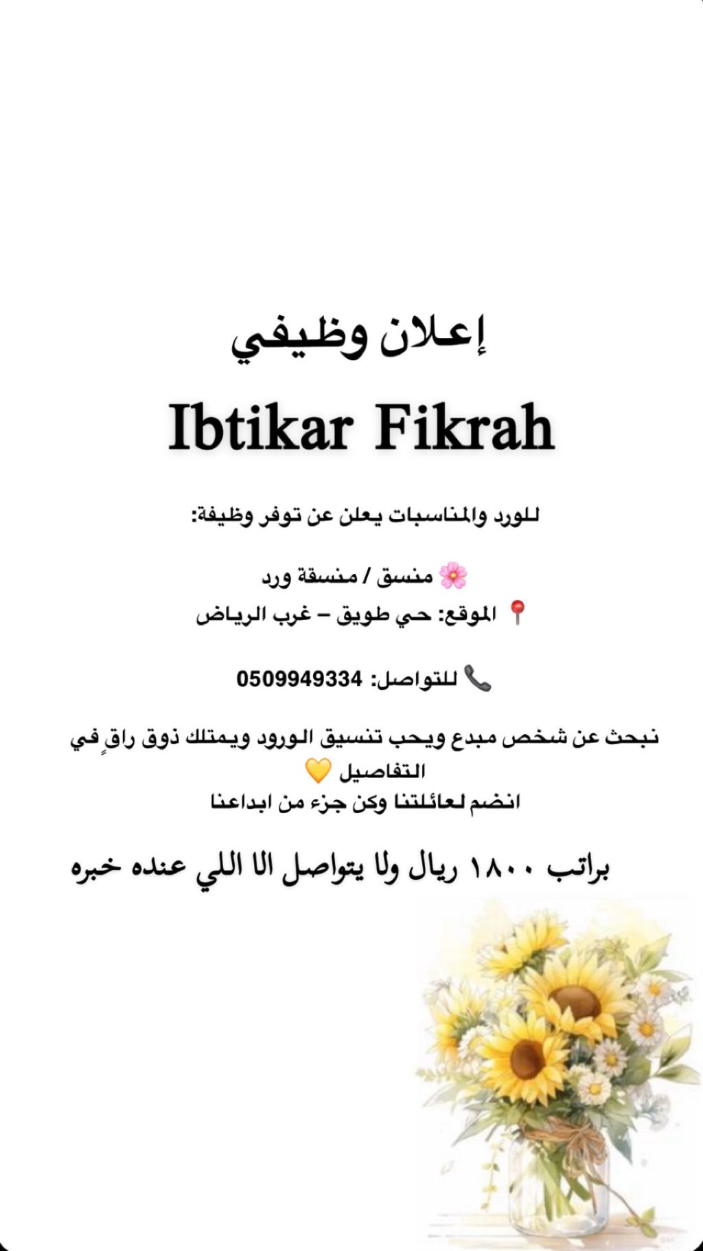 اعلان وظيفي محل Ibtikar Fikrah للورد والمناسبات يعلن عن توفر وظيفة منسق أو منسقة ورد الموقع حي طويق - غرب الرياض السكن متوفر للتواصل نبحث عن شخص مبدع ويحب تنسيق الورود ويمتلك ذوق راق في التفاصيل براتب 1800 ريال رجاء لا يتواصل الا اللي عنده خبرة