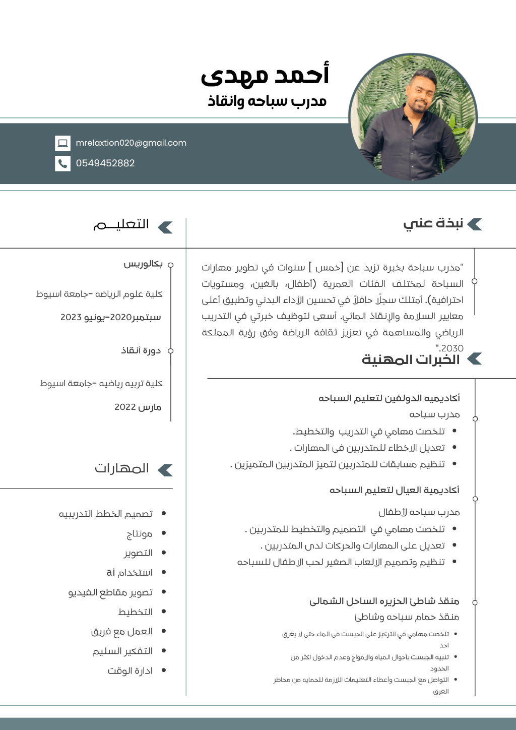 أنا أحمد مهدي مصري مقيم في الرياض ابحث عن عمل حاصل على بكالوريوس العمر 27 سنة الحالة الاجتماعيه أعزب بكالوريوس علوم الرياضة اشتغلت في التدريب في الأكاديميات مصريه والعمل في مدارس مصريه مدرب سباحة معتمد من الاتحاد المصري ومنقذ من الاتحاد المصري للانقاذا وخبرة في مجال السباحة أكثر من 4 سنين