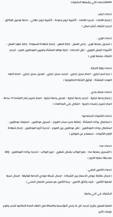 ادارة الخدمات الالكترونية للمؤسسة باشتراك شهري خدمات ابشر خدمات قوى خدمات وزارة التجارة والمركز السعودي للأعمال خدمات منصة بلدي خدمات التأمينات الاجتماعية خدمات مدد خدمات التأمين الطبي للموظفين الاشتراك في تابي وتمارا