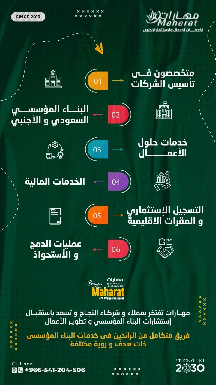 Foreign investment services - Saudi company services, amending the legal entity and articles of association - converting institutions into companies - managing mergers and acquisitions - the unified national registry system - converting a one - person company into a multi - partner company - establishing Gulf companies - acquiring foreign companies - years of experience in building Saudi and foreign
