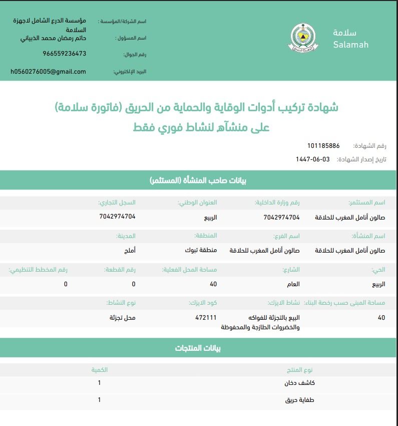 اصدار رخص بلدية للمحلات التجارية ورخص الدفاع المدني وتوفير كافة المتطلبات اصدار عقود صيانة للدفاع المدني استخراج شهادة تركيب أدوات السلامة استخراج التقارير الفنية الهندسية وانجاز استخراج تصريح الدفاع المدني اصدار عقود صيانة الكاميرات لاستخراج شهاد انجاز كاميرات من الشرطة لو احتجت أي حاجة أحنا مكتب ومؤسسة معتمد عند الدفاع المدني (منفذ مباشر)
