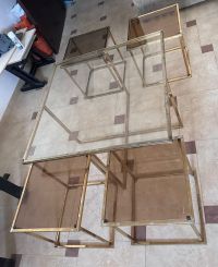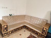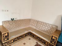 ركنة مودرن حرف L فخمة بحالة ممتازة للبيع مع عدد 4 طاولات خدمة و1 طاولة كبيرة مع ديكور مدخنه
