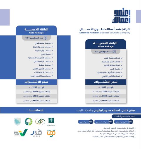نقدم باقات اشتراك مرنة لإدارة أعمالك بكل سهولة، تشمل خدمات المنصات الحكومية، الزكاة والضريبة، التأمينات، حماية الأجور، والتأمين الطبي، مع دعم احترافي يناسب حجم منشأتك. باقات فضية وذهبية أسعار مناسبة وخصومات مميزة حلول متكاملة للشركات والمؤسسات ابدأ الآن واختر الباقة المناسبة لك. للتواصل
