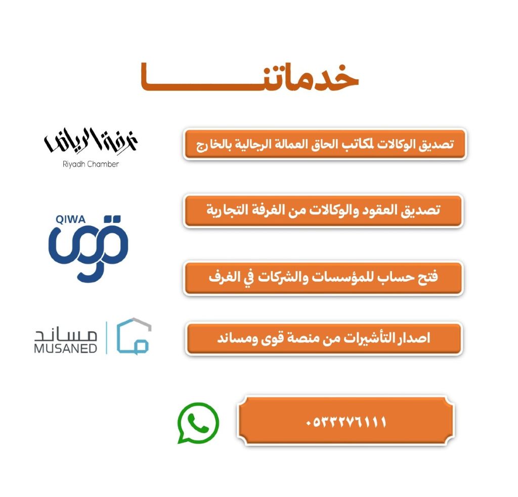 خبرة في تصديق الوكالات لمكاتب الحاق العمالة الرجالية بالخارج تصديق العقود والوكالات من الغرفة التجارية فتح حساب للمؤسسات والشركات في الغرف التجارية اصدار التأشيرات من منصة قوى ومساند (لا يوجد تصديق ملف نقليات أو عمالة منزلية)