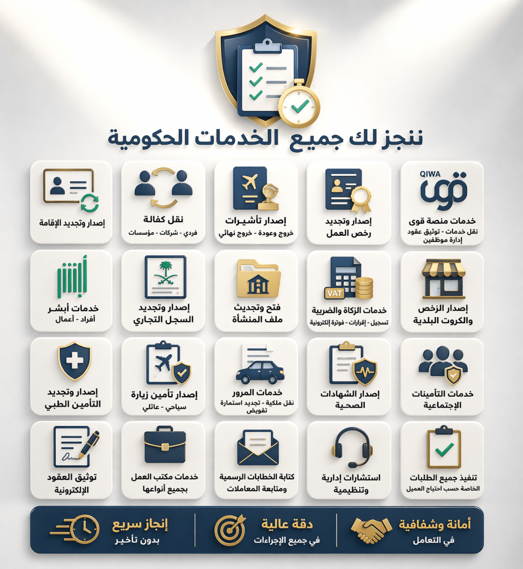 حلولك المتكاملة للخدمات الحكومية انجاز سريع دقة عالية أمانة وثقة هل تعبت من تأخير المعاملات أو تعقيد الاجراءات معنا تخلص كل خدماتك الحكومية بسرعة وراحة بال خدماتنا تشمل إ 1 - صدار وتجديد الإقامة لجميع العمالة 2 - نقل كفالة (فردي / شركات / مؤسسات) 3 - اصدار تأشيرات (خروج وعودة - خروج نهائي) 4 - اصدار وتجديد رخص العمل 5 - خدمات منصة قوى (نقل خدمات - توثيق عقود - إدارة موظفين) 6 - خدمات ابشر (أفراد / أعمال)