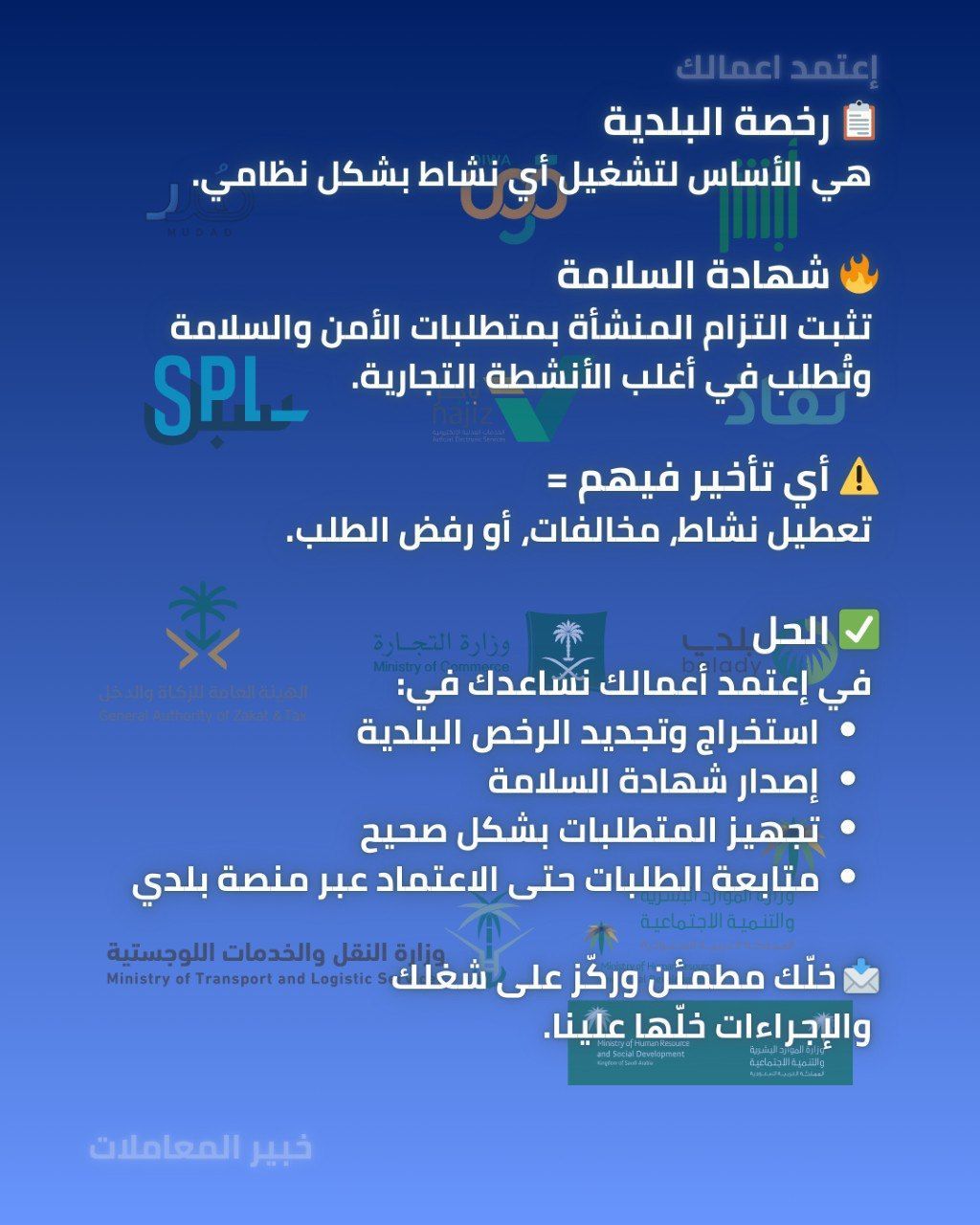 الرخصة البلدية هي الأساس لتشغيل أي نشاط بشكل نظامي. شهادة السلامة تثبت التزام المنشأة بمتطلبات الأمن والسلامة وتطلب في أغلب الأنشطة التجارية. أي تأخير فيهم تعطيل نشاط، مخالفات، أو رفض الطلب. الحل في اعتمد أعمالك نساعدك في استخراج وتجديد الرخص البلدية اصدار شهادة السلامة تجهيز المتطلبات بشكل صحيح متابعة الطلبات حتى الاعتماد عبر منصة بلدي خلك مطمئن وركز على شغلك والاجراءات خلها علي