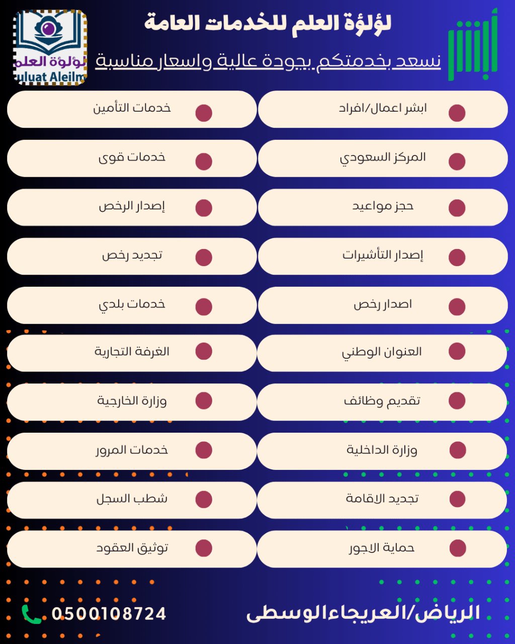 خدمات الجوازات والاقامات اصدار / تجديد هوية مقيم نقل معلومات جواز - تجديد جواز - تمديد خروج وعودة اصدار بدل فاقد أو تالف للإقامة الغاء بلاغ هروب نقل كفالة، تعديل أو تغيير مهنة عقود عمل داخلية وخارجية اصدار وتجديد خروج وعودة لمرافق طفل خدمات المنصات والاعتمادات تصديق زيارة منصة مساند - منصة قوى اصدار بطاقة أحوال بدل فاقد نقل كفالة عمالة منزلية تقليل المخالفات البلدية طباعة الإقامة انجاز سريع