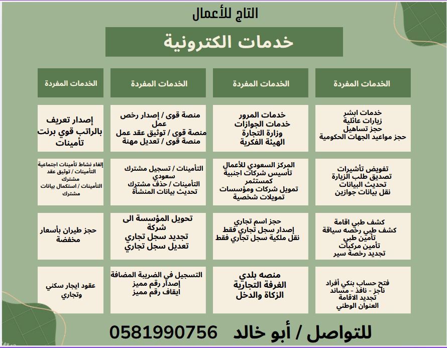 يوجد لدينا جميع الخدمات العامة والالكترونية وتأسيس شركات مستثمرين وسعوديين وكل ما يتعلق بمركز الأعمال السعودي ووزارة التجارة ومنصة إيجار
