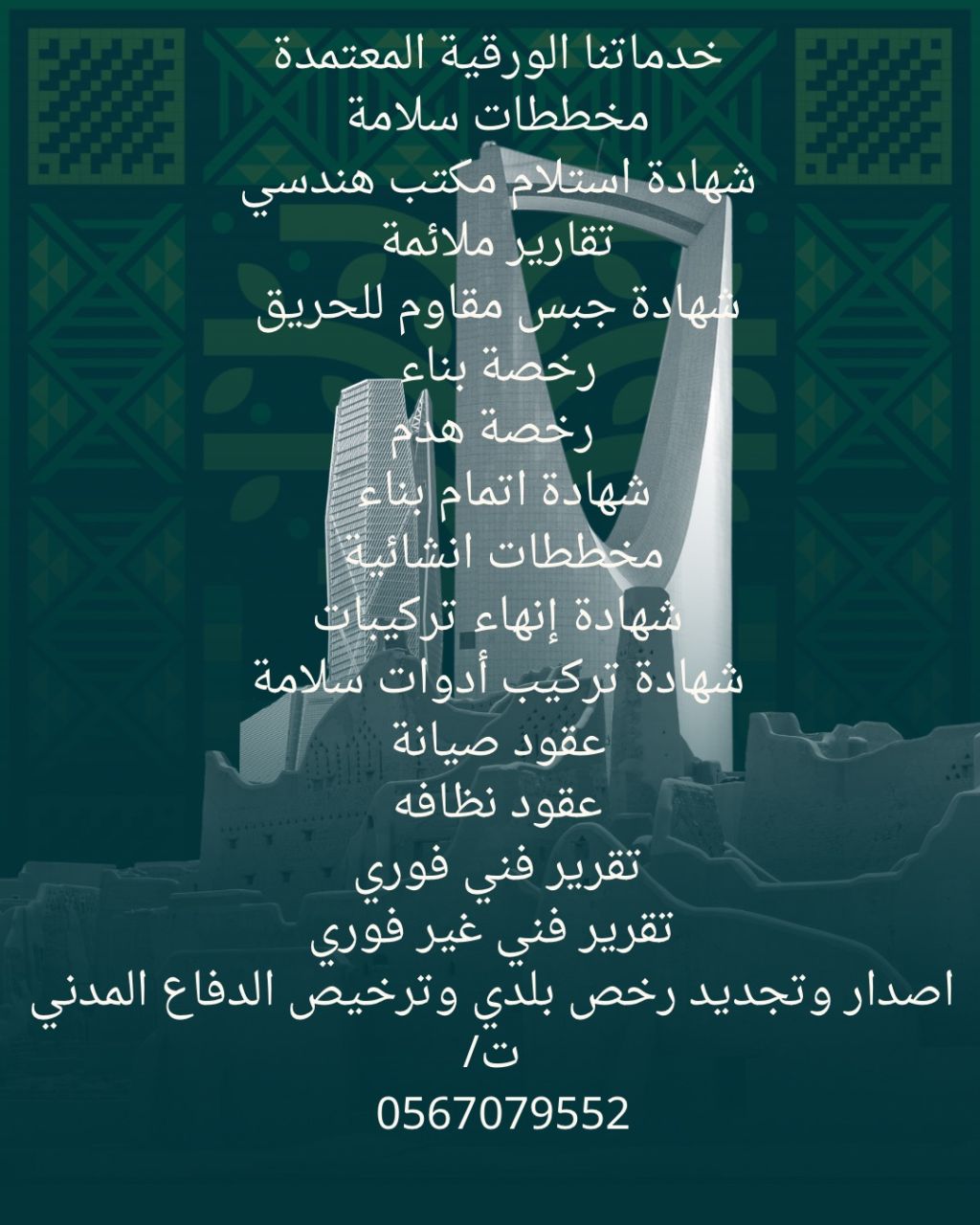 شهادة استلام مكتب هندسي مخططات السلامة عقود الصيانة شهادة انهاء التركيبات رخصة البناء رخصة اتمام البناء رخصة هدم شهادة الجبس المقاوم للحريق
