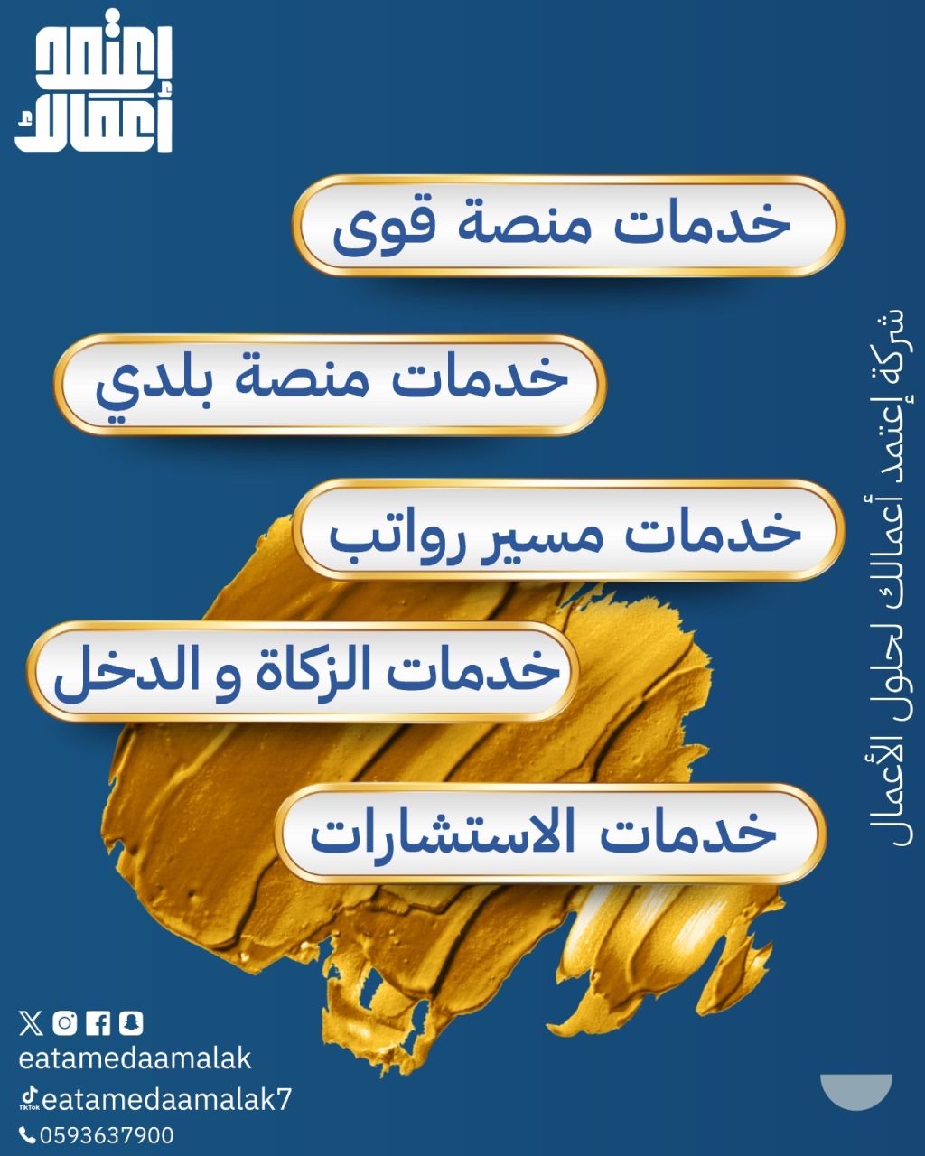 نخدمك في جميع المنصات الحكومية السعودية بخدمة سريعة، احترافية، وموثوقة وزارة التجارة وزارة العمل والتنمية الاجتماعية منصة قوى منصة بلدي منصة مدد منصة انجاز وزارة العدل التأمينات الاجتماعية الزكاة والضريبة والدخل مجلس الضمان الصحي البريد السعودي الجوازات البلديات والأمانات