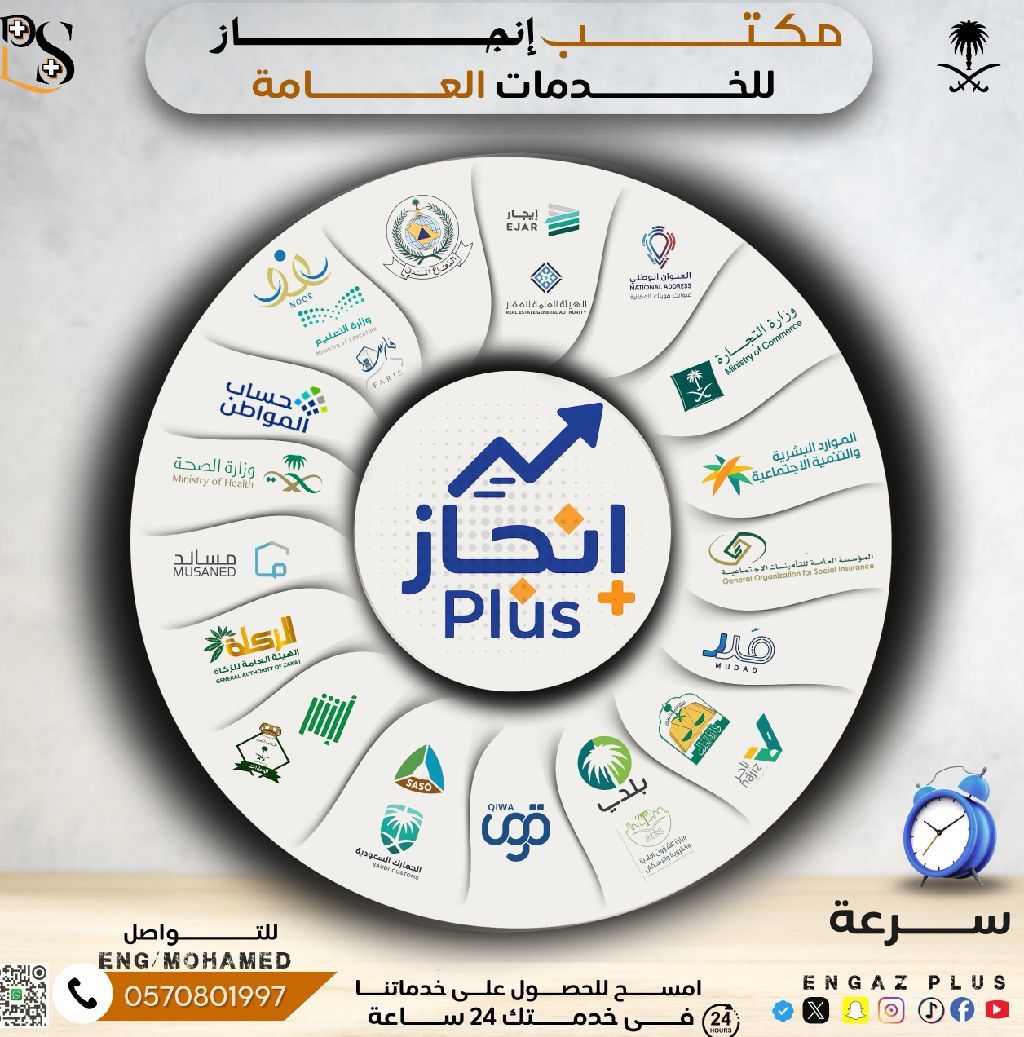 تبغي انجاز سريع، مضمون، وبثقة. يبقى أنت بتدور على "انجاز بلس" للتعقيب والخدمات خدماتنا تشمل كل الجهات الحكومية زي ابشر - قوى - التأمينات - الموارد البشرية - حساب المواطن - وزارة التجارة - منصة مدد - ساند - والكثير غيرهم. بسهولة. وفر وقتك ومجهودك، وسيب الباقي علينا. تواصل الآن مع ENG / MOHAMED سرعة دقة ثقة 24 ساعة لخدمتك اسأل عن عرضنا الخاص