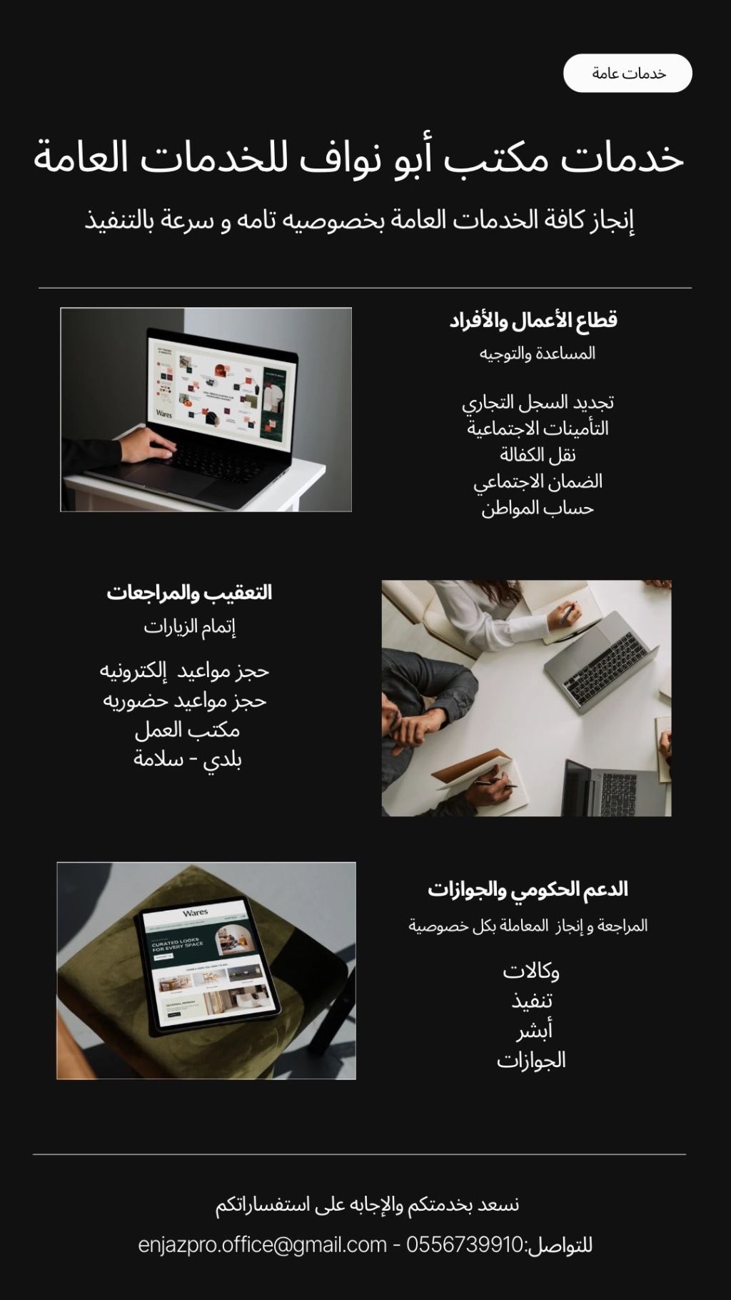 مكتب أبو نواف للخدمات العامة ننجز معاملاتك ونمنحك راحة بال بالانجاز وبكل خصوصية وسرعة متابعة مستمرة حتى اتمام المعاملة خطوة بخطوة سرعة ودقة في جميع الخدمات خصوصية تامة لك ولبياناتك