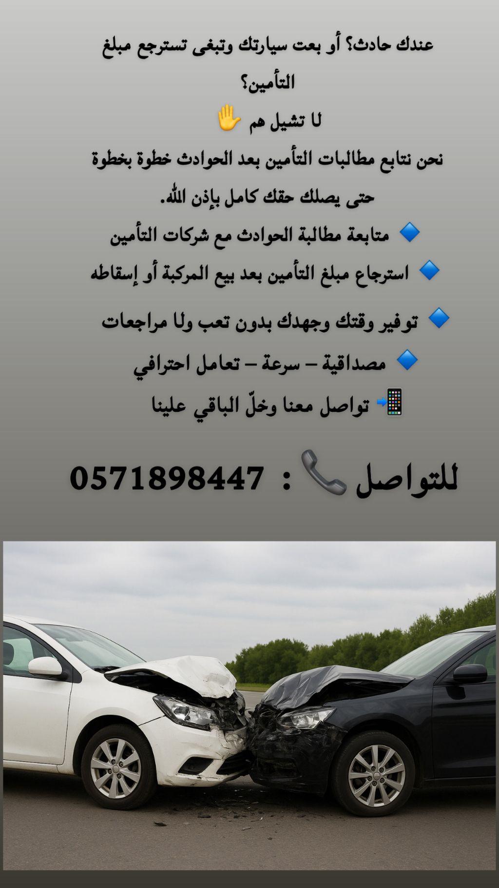 عروض على مطالبات التأمين بعد الحادث شامل أو ضد الغير أو حتى اذا بعت مر كبتك تواصل معنا وأحنا نسترجع باقي مبلغ التأمين خدمتنا سريعة ومتميزة وأسعارنا ترضي الجميع
