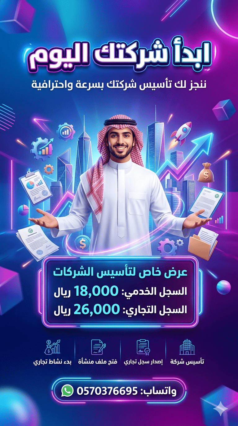 فرصتك تبدأ شركتك في السعودية الآن نقدم لك خدمة تأسيس الشركات بالكامل بسرعة واحترافية. عرض خاص السجل الخدمي 18000 ريال السجل التجاري 26000 ريال وننجز لك جميع الاجراءات