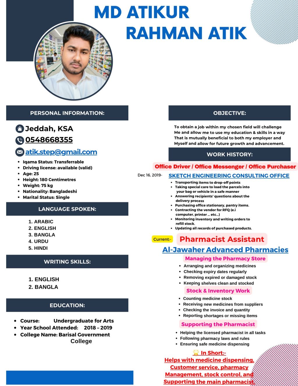 ابحث عن وظيفة مساعد صيدلي مشرف نظافة مكاتب حارس - لدي خبرة تزيد عن ست سنوات أحمل رخصة قيادة سارية المفعول اقامة قابلة للتحويل العمر 25 عاما المؤهل العلمي بكالوريوس الطول 180 سم - الوزن 75 سم - أتحدث العربية والانجليزية والبنغالية والهندية والأردية