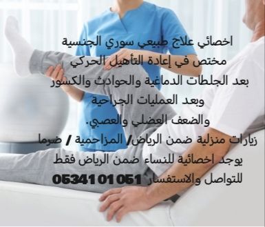 أخصائي علاج طبيعي وتأهيل حركي سوري زيارات منزلية ضمن الرياض. ضرما. والمزاحمية. سعر الجلسة يبدأ من 200 ريال. تأهيل الحركة بعد الجلطات الدماغية وبعد الحوادث والعمليات الجراحية وبعد الضعف العصبي والعضلي وتبديل المفاصل. أخصائي سوري خبرة عالية والعلاج ب أحدث الاجهزة والتقنيات العلاجية اليدوية. يوجد أخصائية للنساء. ضمن الرياض. للتواصل