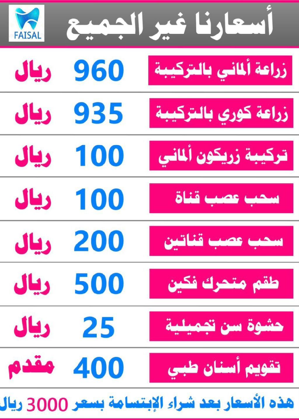 خدمات طبية بأسعار تنافسية وأسعارنا غير الجميع وعروضنا متوفرة في الرياض في مركزين الأول بحي المصيف والثاني في الحنادرية زراعة ألماني بالتركيبة 960 ريال زراعة كوري بالتركيبة 935 ريال تركيبة زر يكون ألماني 100 ريال سحب عصب قناة 100 ريال سحب عصب قناتين 200 ريال طقم متحرك فكين 500 ريال حشوة سن تجميلية 25 ريال تقويم أسنان طبي 400 مقدم وهذه الأسعار بعد شراء الابتسامة بسعر 3000 ريال