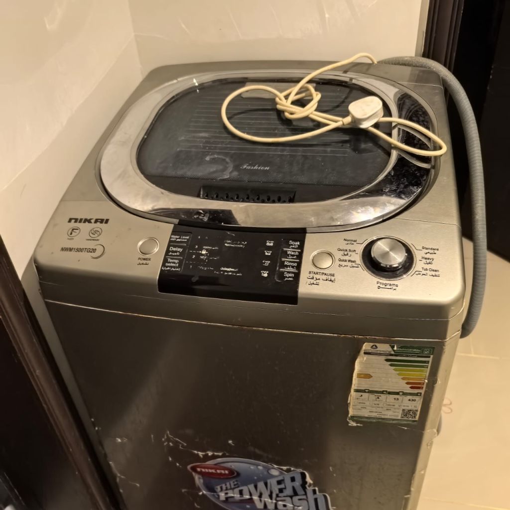 غسالة نيكاي أوتوماتيك 14 كيلو. نظيفة وامورها تمام بس أحيانا تعلق فالتنشيف وتتصلح عادي مطلوب 250 ريال