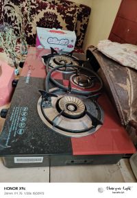 غاز 3 عيون شبه جديد استعمال 3 مرات فقط حديد قوي وسطح قزاز، تشغيل تلقائي بدون ولاعة، مستويات عديدة وتحكم بالشعلة، البيع لعدم الحاجة له